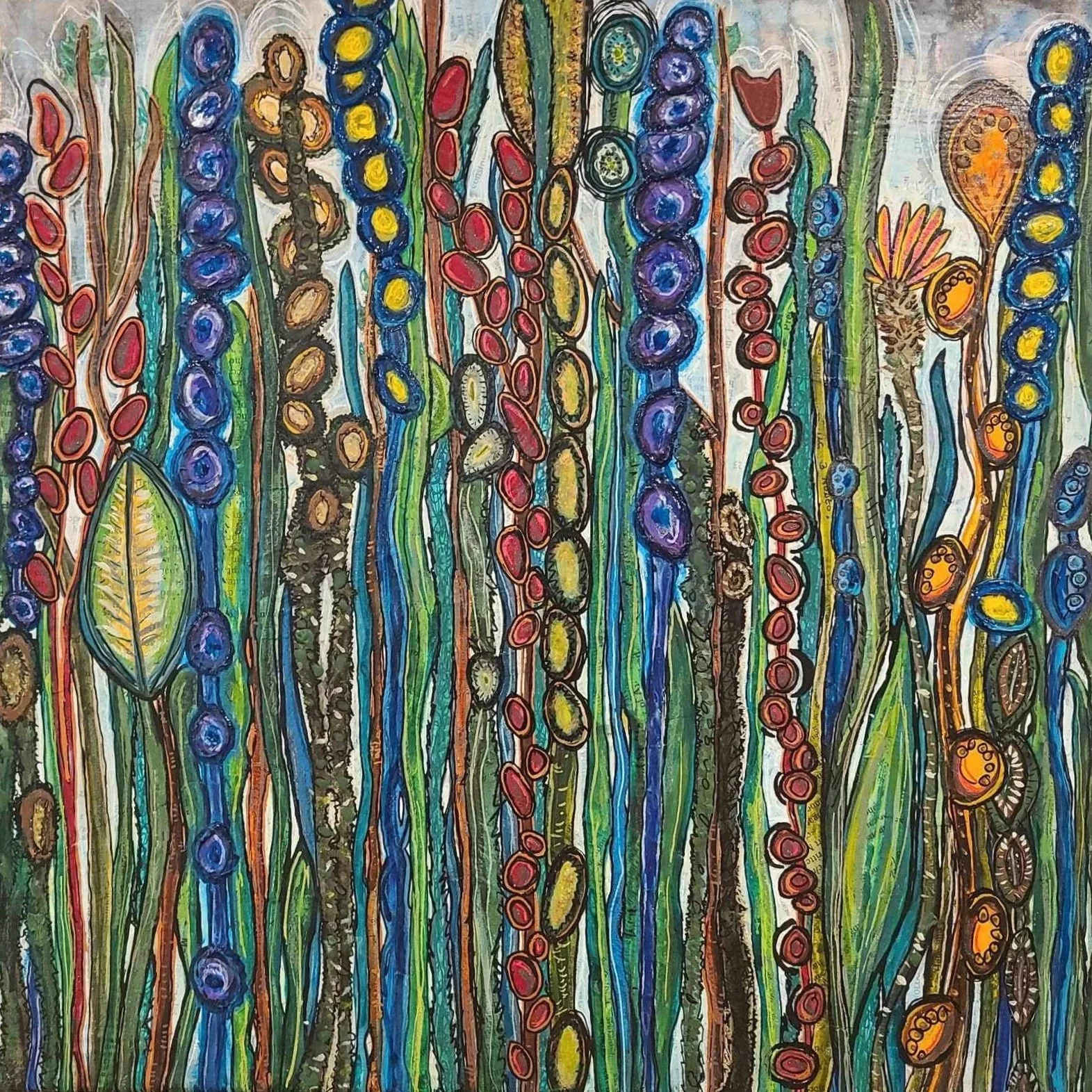 For the past 15 years, Michele has spent time learning and working with different artistic media. She uses a variety of traditional media, often in unique ways, such as boiling paint directly on the canvas. Additionally, she loves to recycle and reuse items in her art. You can often find recycled book pages, textiles, or tiny unexpected items within her work.